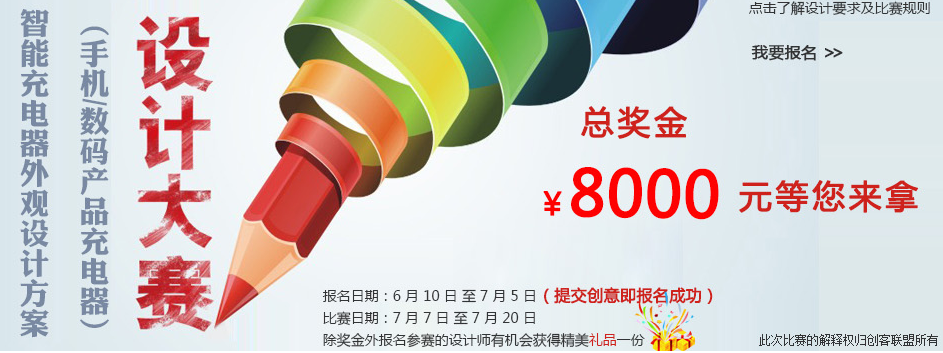 文章概述:來創客聯盟做中國好設計,本次大賽主要圍繞智能充電器外觀的設計和手機、數碼等產品為主,除此之外,8000元現金大獎和精美禮品也成為了此次大賽的亮點。
